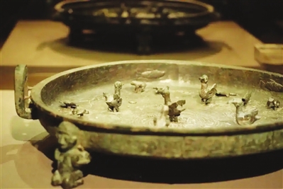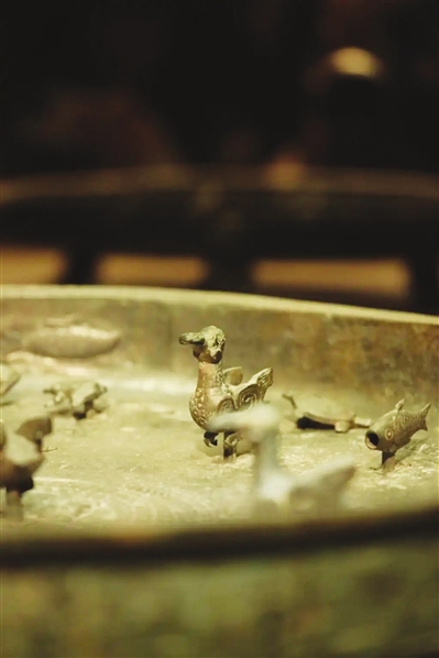 晋公盘是晋式青铜器的巅峰,构思设计无与伦比,分铸工艺运用到极致。盘内19个圆雕小动物,均可稳稳地原地旋转,内部结构充满巧思与技术难度,鸟嘴可以开合,衔接轴细如绣花针。盘耳、足、饰件,处处体现出技术与艺术的完美融合。不同于传统青铜器的庄严肃穆,晋公盘展现出令人惊喜的灵动之美,水鸟欲飞,青蛙跳跃,盘龙戏水,鱼儿摆尾。当清水注入盘中,这些青铜精灵呈现出一派热闹的夏日池塘景象。