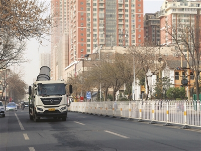 近日,我市出现连续扬尘天气。相关部门采取措施,降低扬尘带来的影响。图为3月25日,杏花岭区生态环境局多功能抑尘车在上肖墙作业。 张澍宏 摄