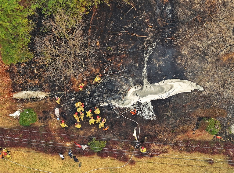 3月26日,在韩国庆尚北道义城郡,消防员在直升机坠落事故现场进行调查。