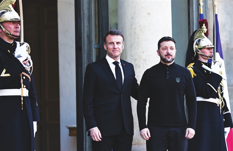 3月26日,法国总统马克龙(中左)在巴黎总统府爱丽舍宫迎接到访的乌克兰总统泽连斯基。