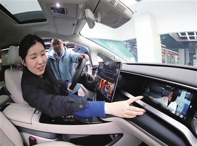 3月30日,在某新能源汽车品牌店内,消费者正在了解车内智能化设备。随着环保理念深入人心与政策利好持续释放,我市掀起新能源汽车以旧换新热潮,不少市民到4S店看车、换车。