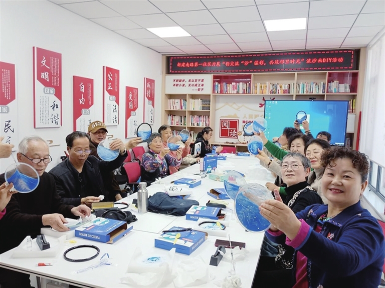 实践环节中,居民们小心翼翼地将彩沙注入瓶中,调配颜色、设计图案。经过精心制作,一幅幅独具特色的流沙画作品逐渐成型。大家自豪地展示成果,拍照留念,现场洋溢着欢乐与成就感。