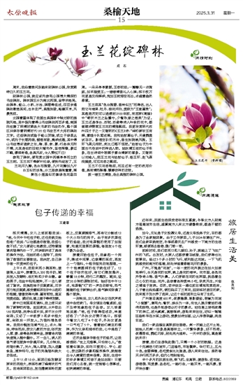 参观了碑林,便观赏北园中两棵亭亭而立的玉兰树。玉兰花不等新叶吐绿,便抢先绽放了,玉兰花开九瓣,色白而微碧,九片花瓣如九片白玉似的汤匙,分三层参差倒置着,围聚在小莲座似的紫绿色花蕊四周。一朵朵亭亭素颜,玉容皎洁;一瓣瓣无一点微疵,如羊脂美玉;一缕缕清香沁人心脾;那千枝万花更是交相辉映,宛如玉树排空而出,点缀着盎然春意。