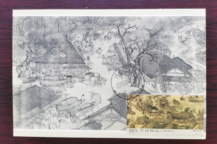 我们知道,《清明上河图》表现的是北宋年间东京汴梁(今河南开封近郊)清明时节繁盛热闹的城乡、街市、水道间的风土民情。所以这套《清明上河图》极限明信片,一是要在清明节制作,二是要到河南开封的清明上河园附近的邮局去盖戳制作。我于2015年清明节当日来到离开封较近的邮局盖戳制作,这套极限明信片才最终得以呈现。