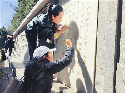 描摹烈士碑文环节,党员志愿者手持金漆笔,俯身于斑驳的石碑前,屏息凝神,一笔一画地勾勒。金漆在阳光下流淌,模糊的字迹逐渐清晰,仿佛时光倒流。俯身勾勒斑驳碑文的任女士感慨道:“金漆流淌时,仿佛看见烈士用热血书写信仰。”