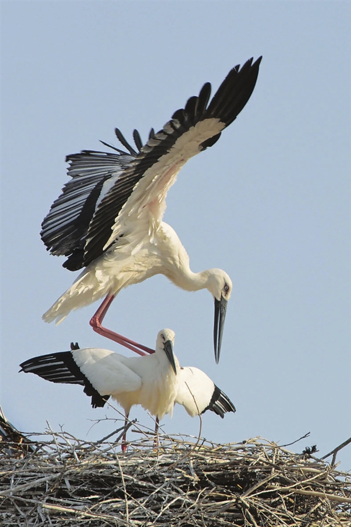 这是4月1日在齐齐哈尔市南郊拍摄的东方白鹳。