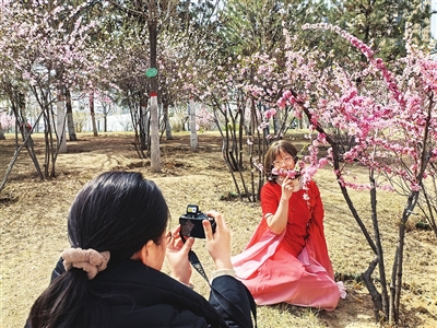 4月5日上午,在滨河体育公园的花丛中,天津游客刘晓妍身穿马面裙,网格员赵旭芳变换角度,“咔咔”按下快门。这名游客独自来太原,顺便到恒大滨河左岸小区看望好友。好友拿出马面裙,让她换上,请网格员帮忙拍几张好看的照片。