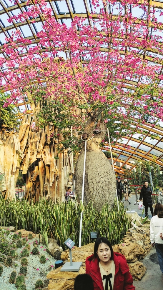 沙生馆里,仙人掌、芦荟、金琥等常见沙漠植物随处可见,还有花开独特的“龙凤牡丹”、形如钢针的“地狱魔针”、能喂饱猴子的“猴面包树”。看着这些形态各异的植物,适者生存的自然法则深深印入我的脑海。