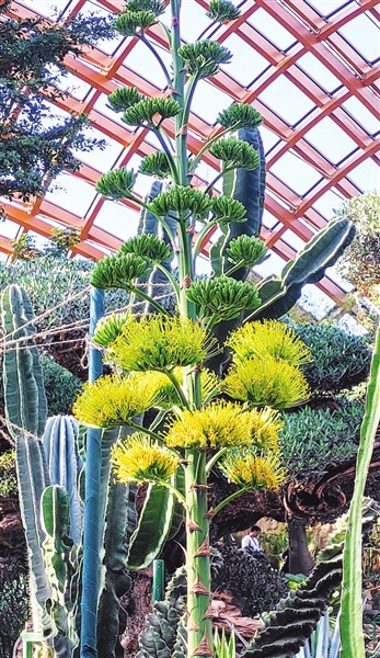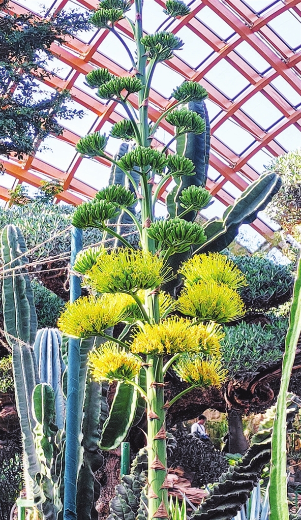 随后,我们步入沙生馆。高达15米的场馆内,汇聚了来自世界四大洲的400多个品种的沙漠植物。馆内还原了沙漠燥热干燥的气候,置身其中,酷热难耐,但眼前的植物奇观让我们忘却了不适。原产墨西哥中部的龙神木,高达十余米,株形挺拔饱满,蓝绿色的肉质茎挺拔饱满,尽显纯净自然之美。在墨西哥,它常被当作水果售卖,因其亲和力强,在国外还被誉为“万能砧木”。