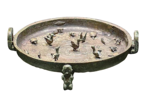 孟姬仔细观察过,此盘花样众多,大体分浮雕、圆雕两种。浮雕除盘底中央盘绕成圆形的一对精美双龙外,另有4只金龟、7只游泳状青蛙,及内壁的4条游鱼,共17个。圆雕包括5只水鸟、7只青蛙(三跳四蹲)、3条游鱼、4只爬行乌龟,以及作为支足的三个裸体人形,共22个。圆雕动物都非常可爱,充满乐趣。另有裸体人形,也都低眉顺目,默默跪坐,安详地肩负着身上的圆盘。