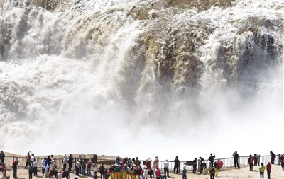 4月9日,游客在山西吉县黄河壶口瀑布景区欣赏壮美“桃花汛”。