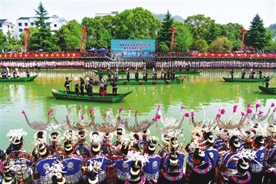 当日,贵州台江2025年苗族姊妹节苗歌对唱活动在台江县翁你河畔举行。来自台江县的万余名苗族群众,身着节日盛装齐聚翁你河畔,以传统对唱的方式,向游客展现苗族飞歌、情歌,欢庆姊妹节。