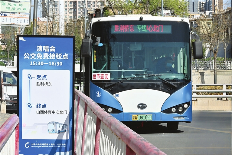 4月14日,太原公交开通公交接驳专线,广大歌迷朋友可凭票免费乘坐。图为公交四公司演唱会专线公交车在胜利桥东接驳点等待歌迷上车。 郭苑甫 摄
