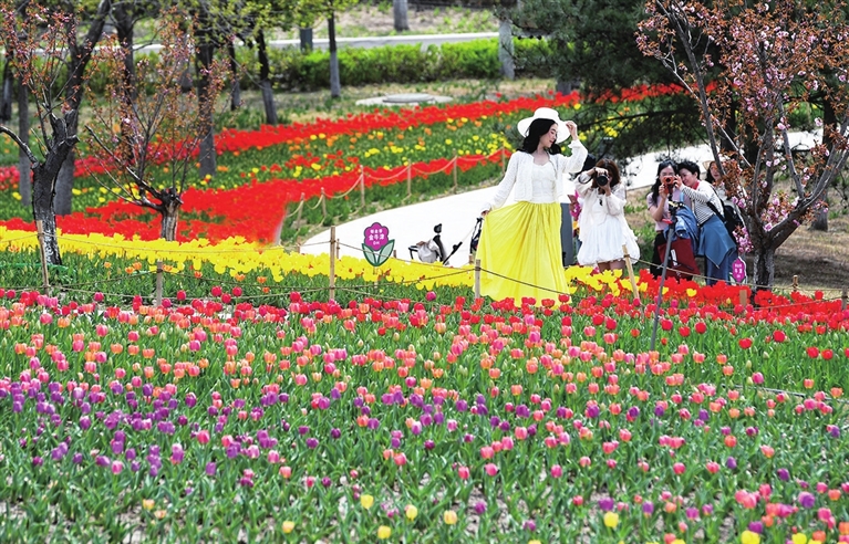 4月15日,晋阳湖公园2025年郁金香花展启幕。21个品种组成的郁金香花海,与游客来一场春日之约。