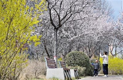 近日,古交市汾河公园春花绽放,游人驻足欣赏。 郭苑甫 摄