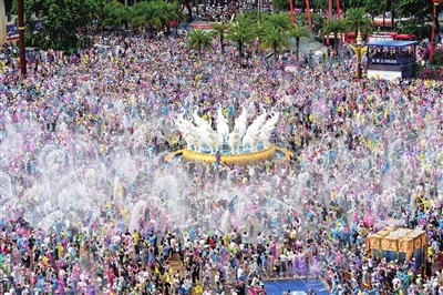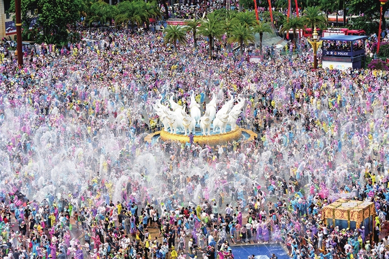 4月15日,人们在云南省西双版纳傣族自治州景洪市泼水广场泼水狂欢。