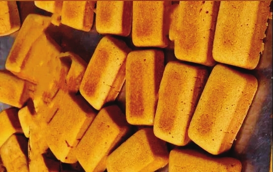 打“钢砖”的操作方法看似简单,操作起来却十分严谨,来不得半点马虎。用小苏打、糖精和少量发面按比例加水、玉米面和在一起,和面的水温依季节而定,面要软硬适中。面硬,烤出来的“钢砖”表面容易出现裂纹;面软,烤制成型慢,容易夹生。另一方面,掌握烤炉的火候也很重要。把和好的玉米面用定量的勺子盛在抹上油的“钢砖”模子里,放在一个大烤盘上,一个烤盘可放置16个“钢砖”模子,有似耐火砖的,有似齿轮的,把盛满面的模具放在烤盘上摇一摇,使面均匀后放入烤炉烤制,大约25分钟出炉。