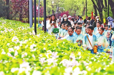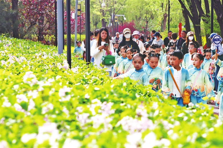 4月16日,后小河小学在龙潭公园举行“走进春天的自然世界”实践研学活动,师生们近距离感受春色之美,学习植物知识。 张澍宏 摄