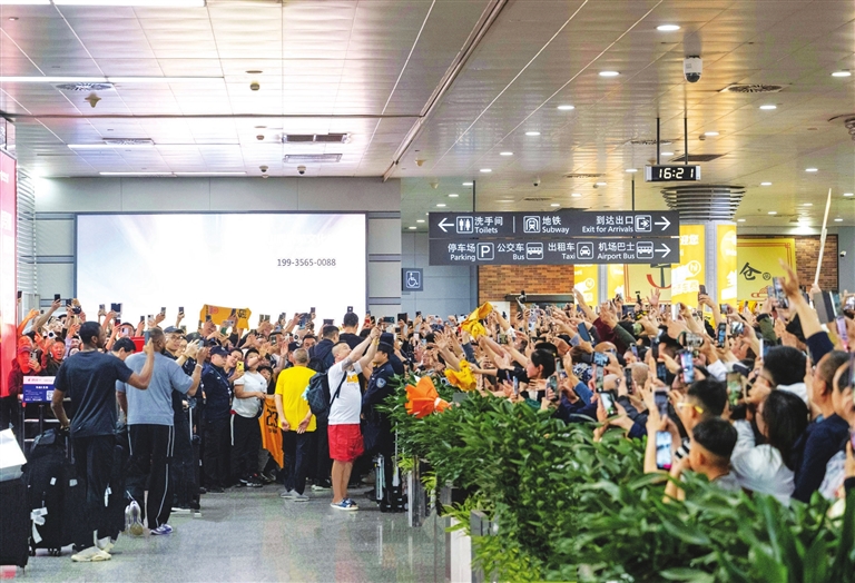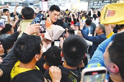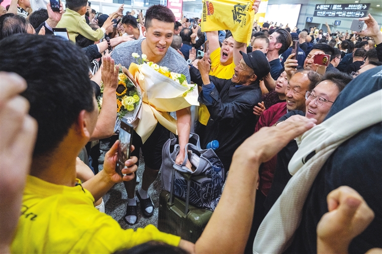 山西汾酒男篮3比0战胜广东东阳光男篮,挺进四强。4月20日,太原武宿国际机场,山西球迷热情迎接男篮队员们凯旋。