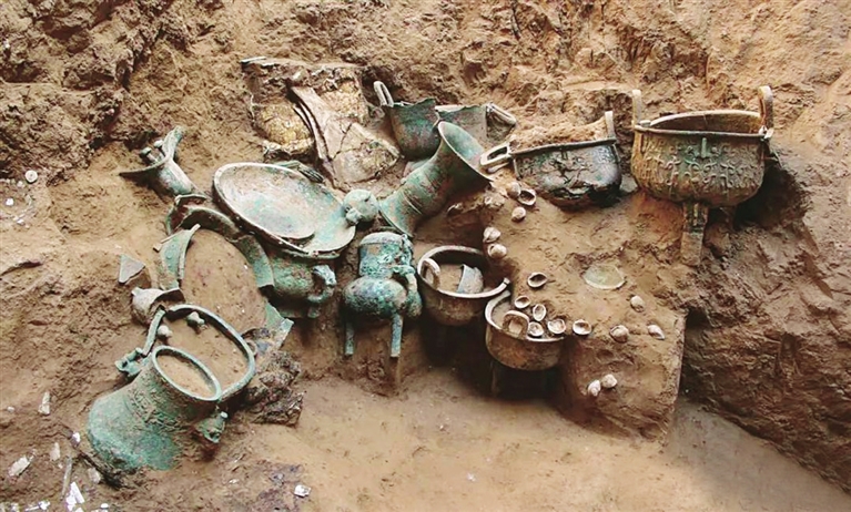 该墓残存随葬器物385件(套),种类齐全,数量丰富,有铜器、原始瓷器、陶器、玉器、漆木器、骨器、蚌贝器共七类。包括青铜礼器25件,原始瓷器2件,陶器3件等。