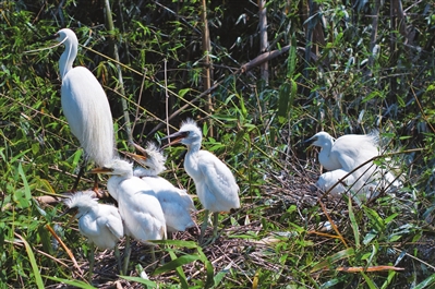 4月20日,在重庆市大足区珠溪镇,白鹭幼崽等待父母投喂。
