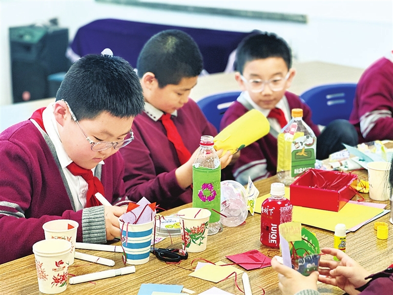 为迎接第56个世界地球日,4月21日,上马街二社区组织辖区青少年开展“废旧材料焕新生,垃圾分类我先行”环保手工制作活动。废旧纸箱、塑料瓶、一次性纸杯等材料在孩子们手中焕发新生。10岁的张一航兴奋地说:“我要把家里的快递盒都存起来,做成更大的分类箱!”社区负责人表示,这不仅是一次手工活动,更是一堂生动的环保教育课。 郭晓华 陈曦 摄影报道