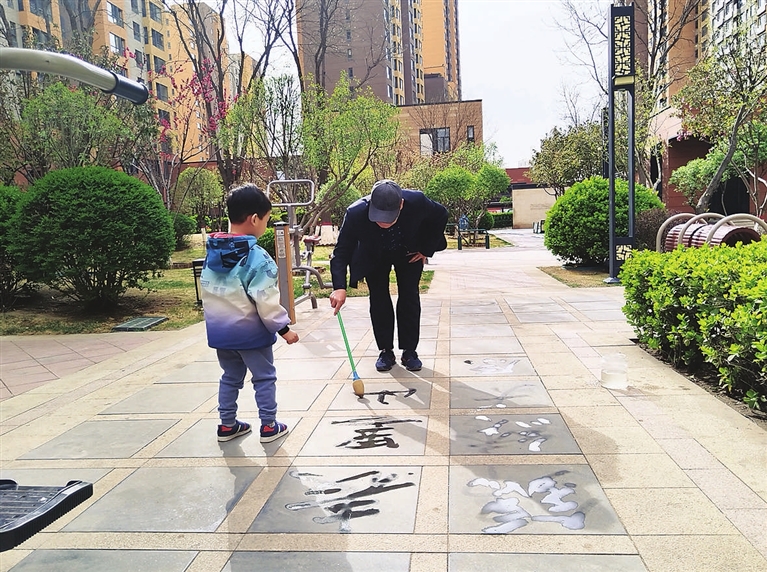 众纺路社区网格员王和在小区巡查时,常看到张大爷在楼下练字,旁边总有居民认真观摩。老人用长杆笔,蘸上水,慢悠悠地书写。这边刚写完,那边字迹已晒干,又能重新写。23岁的侯先生很感兴趣,老人递上笔让其尝试。可是,笔不轻,侯先生掌握不了力度,写出来的字歪歪扭扭。