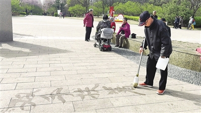 在万科蓝山小区二期,只要天气晴好,66岁的刘春宝就会拎着一桶水,到楼下写地书。只见他气定神闲、手腕轻挥,字迹瞬间跃然“地”上。