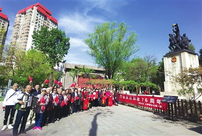 上午9时,文瀛公园革命烈士纪念塔前,老校友们整齐列队。这些曾扎根太原教育、工业、服务等领域的老同志,虽已鬓发斑白,却个个精神矍铄。当《没有共产党就没有新中国》的旋律响起时,老人们挺直腰板,用饱含深情的歌声拉开了活动序幕。88岁的退休教师张建功作为解放太原的亲历者,与校友们共同见证了这座城市从战火中重生的历程。动人的歌声吸引了不少市民自发加入合唱,大学生王颖更是全程用手机记录。活动尾声,全体参与者齐声朗诵《少年中国说》,铿锵有力的誓言在公园上空久久回荡。