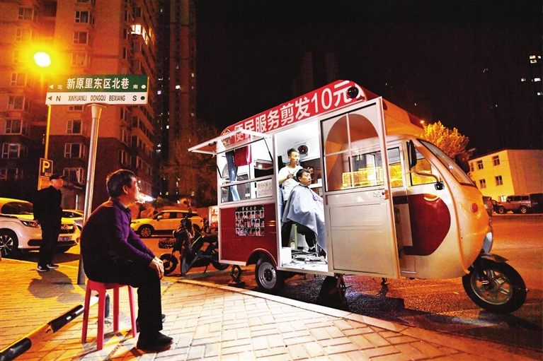4月27日,省城街头,一辆便捷实用的“理发”车停在路边,为附近居民提供服务。 邓寅明 摄