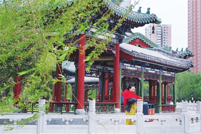 5月7日,我市迎来降温天气,最高气温降至18℃。图为迎泽公园里戴着围巾保暖的游客。 张澍宏 摄