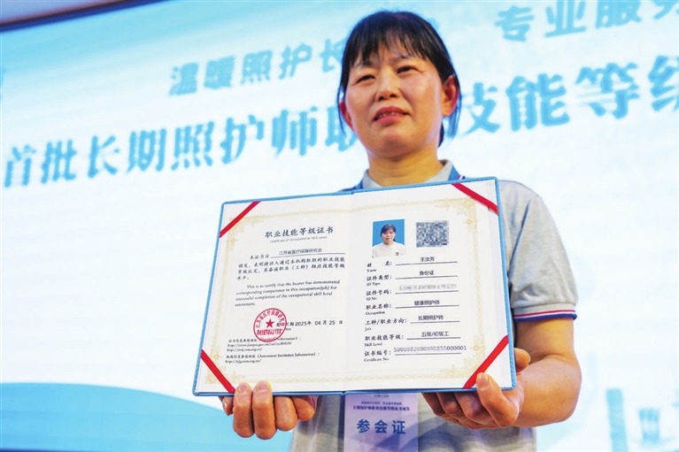 “学习考证的过程,让我掌握的技能更加全面,提供服务更有底气。”从洗发、穿脱衣物等生活照护,到测量血压、血糖等基础护理,再到识别噎食、误吸等应急处置……王汝芳通过了系统的学习培训,现在“持证上岗”。她说:“长期照护师证书是对我专业能力的认可,增强了我对未来职业发展的信心。我将以这份新职业为起点,用专业和爱心服务更多的失能人士和家庭,更好守护失能人士的生命尊严。”