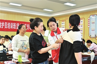 5月8日,万柏林区红十字会走进小井峪街道蓝山社区开展了急救知识培训专场。社区志愿者和居民在专业人员的指导下学习AED(自动体外除颤器)使用和急救包扎。 郭苑甫 摄