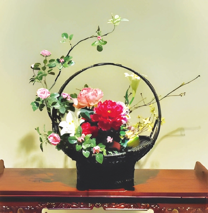 篮最初并不是插花器皿,而是作为普通百姓的生活用具,后被宫廷贵族改良,逐渐演变为插花器皿。据史记载,篮花起源于唐代的礼佛供花,其造型典雅脱俗、意境悠远,彰显出圣洁庄重的气质。传统篮花制作工艺精巧,花篮多采用竹、柳、藤等天然材料编织而成,质地轻盈通透、造型秀美多姿。篮内空间开阔,通常借助花插或花泥固定花材,使花枝与篮子自然融合。此外,篮把的设计不仅便于携带传送,更在艺术表达上蕴含深意,体现了中国传统文化中对平安吉祥、和谐安康的美好祈愿。在花材选择上,篮花常选用牡丹、月季等中国传统名花,通过花朵的娇艳姿态传递吉祥和谐的美好愿景。
