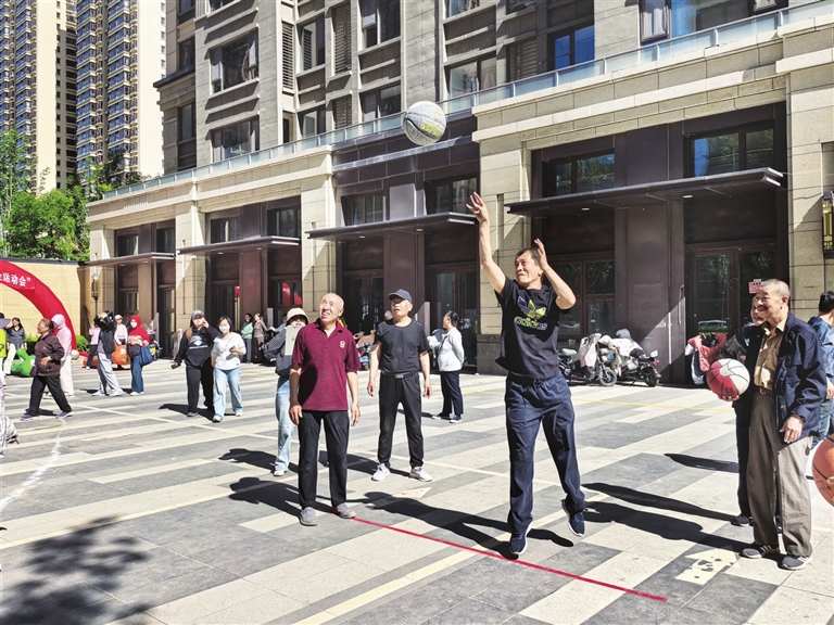 旱地龙舟、60秒投篮、仿古投壶、沙包投掷、蒙眼敲锣、同心击鼓等项目,都很有意思。听说社区要为老年人办“专属”运动会,退休在家的老年人都踊跃参加,甚至有人一口气报名好几个比赛项目。居民侯大娘说,借这个机会,老邻居凑在一起,图个乐和。现场欢声笑语不断,参与者、旁观者都很激动。旱地龙舟项目,大家喊着口号,快步向前,展现出团队协作的力量;60秒投篮,考验精准度和反应能力;仿古投壶,让居民们在竞技比拼的同时,也能感受到传统文化的魅力。