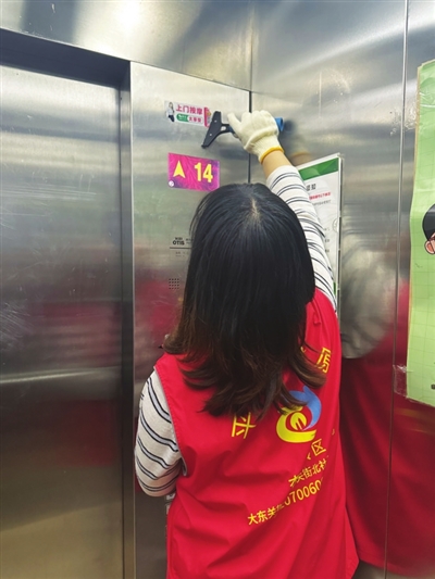 大东关街北社区网格员王聪在建设北路大东关街北巷太铁佳苑小区巡查时发现,小区各个楼內的电梯内最近被张贴了大量小广告,有碍环境卫生。王聪立即找来铲子等工具,联合物业人员对小广告进行清理。共清除数百张小广告,电梯内的环境得到改善。