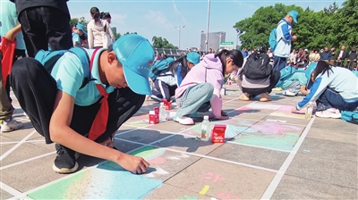 活动现场变身巨型艺术长廊,孩子们以粉笔为笔、马路为纸,将创意与热情倾注于画作。有的用细腻笔触重现红色经典场景,向革命先辈致敬;有的则展开想象的翅膀,描绘出科技感爆棚的未来世界;还有的用心勾勒出充满爱与温暖的和谐家园,传递着心中的美好期许。童真与热忱交织,每一幅作品都成为孩子们内心世界的生动写照。