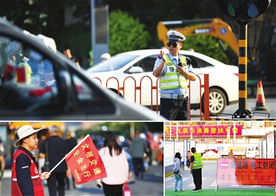 5月26日,新建路封闭施工后首个工作日,周边路段交通压力骤增。交警、志愿者全力以赴疏导交通。
