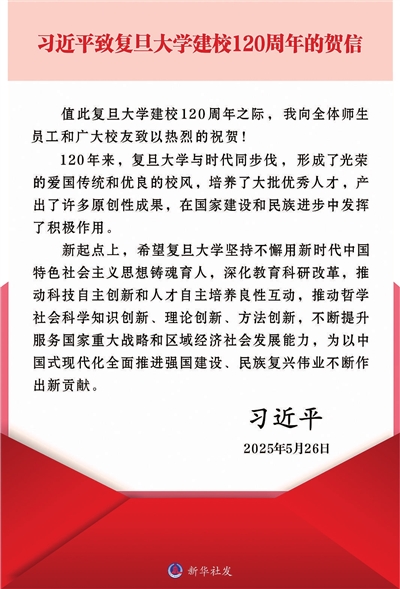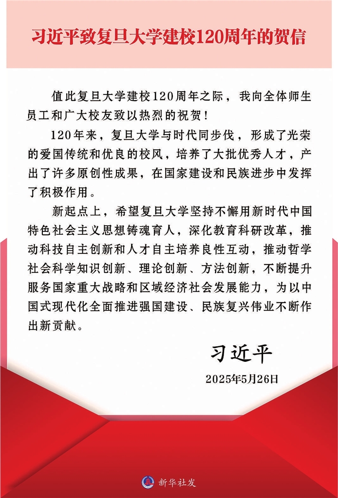 习近平在贺信中指出,120年来,复旦大学与时代同步伐,形成了光荣的爱国传统和优良的校风,培养了大批优秀人才,产出了许多原创性成果,在国家建设和民族进步中发挥了积极作用。