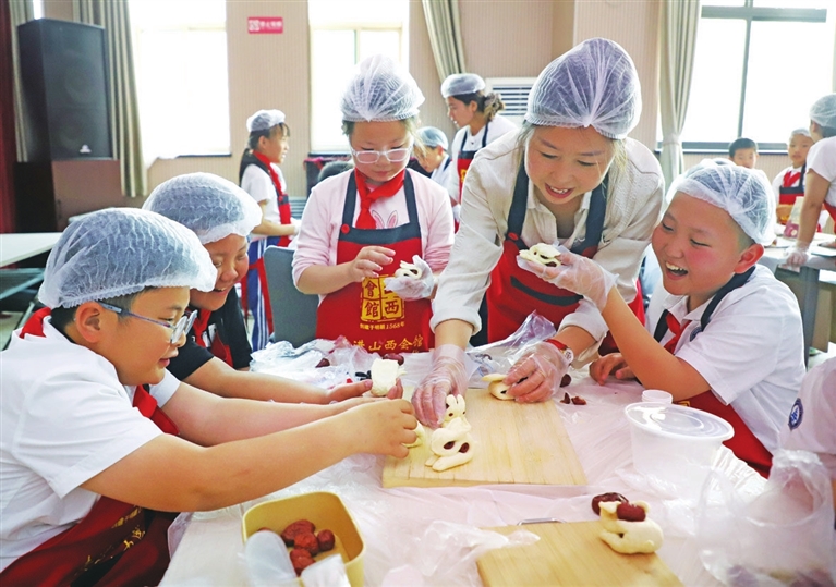 5月26日,迎泽区松侨小学举办劳育实践活动,面点师傅手把手教授技艺,学生们从中感受劳动之乐,了解山西面食文化。 张昊宇 摄