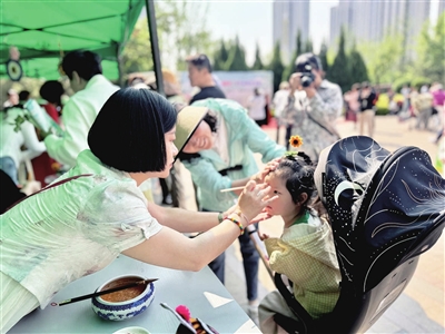 滨体社区开展的端午活动中,画额环节,吸引了不少居民参与。居民侯女士说:“查阅资料才知道这个习俗,长知识了。”社区工作人员向大家讲解,画额是端午节传统习俗之一,用雄黄酒于儿童额头绘制“王”字,寄寓平安避灾的美好愿望。此外,现场还设有茶艺竞技,选手们身穿传统服饰,展示宋代点茶技艺。碾茶、注汤、击拂、分茶,人们在氤氲茶香中,品味着中华传统文化之美。
