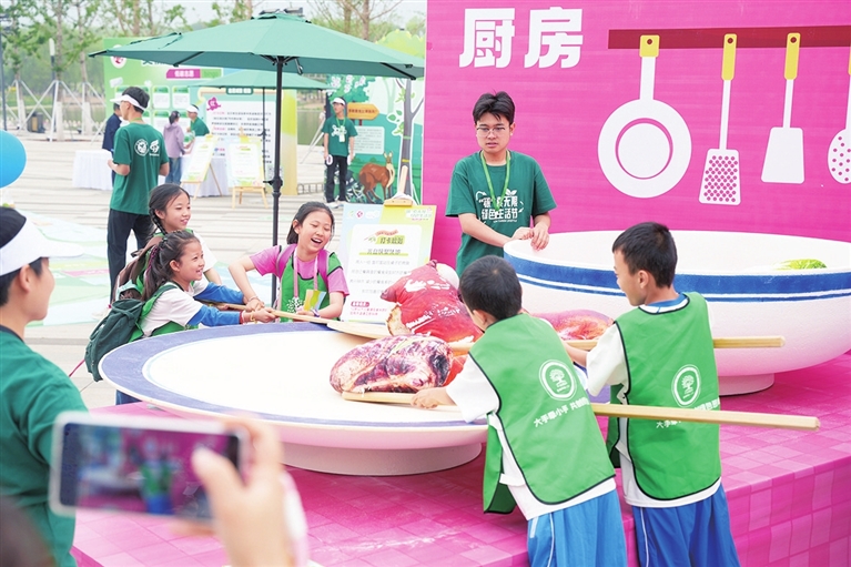 “妈妈快看,我全部完成啦!”在光盘侠聚集地游戏区,不少小朋友努力用巨型的勺子和筷子,将包装成食物的沙包逐一归置。一旁陪同的家长笑着伸出大拇指:“光盘行动,不留剩菜。真棒!”