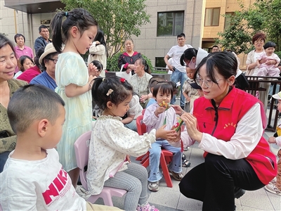 5月28日下午,松庄社区端午节亲子活动现场,身穿红马甲的武瑕正向亲子家庭讲解端午习俗。29岁的她,性格开朗,充满活力。她生动地介绍艾草香包的起源和寓意,耐心示范制作步骤。在她的指导下,孩子们兴致勃勃地挑选布料、填充香料,一个个精美的香包很快呈现在大家面前。