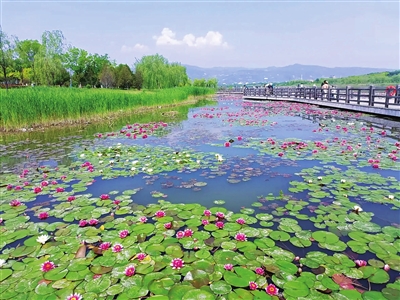 睡莲,生于池沼、湖泊之中的美丽花卉,以其“出淤泥而不染、濯清涟而不妖”的特质,赢得无数文人墨客的赞誉。沿晋阳湖南岸西行,随着木栈道伸延,湖面逐渐平阔,大片大片的睡莲扑入眼帘,仿佛进入莫奈的画作中,令人沉醉不知归路。暗红、粉红、纯白、嫩黄……朵朵睡莲娇羞绽放,挤挤挨挨、层层叠叠,微风拂过,沙沙作响、摇曳生姿。更妙的是,“鱼戏莲叶间”、水鸟当空舞,人与自然和谐共处的画面让人心生宁静!