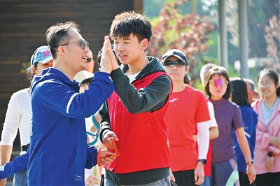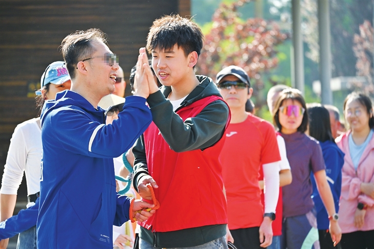 4月的一个周日,袁莉带着儿子来到和平公园。“我想让他明白,帮助别人是件有力量的事。”小男孩攥着陪跑绳,一路认真提醒:“左前方有树桩”“前面要上台阶”。跑完一圈后,视障跑者老苏夸他“带得真稳”,孩子额头上的汗珠里闪着自豪。“以前他总说跑步无聊,现在每周都盼着来当‘小眼睛’。”袁莉说。
