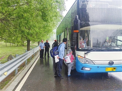 接到汇报,派出所所长立即与云顶山景区入口管理处联系,经协调沟通,景区特事特办,开通绿色通道,允许接送师生的大巴车进入。同时,民警、辅警在现场维持秩序,安抚师生情绪,提醒大家注意安全,避免滑倒摔伤。经过紧张有序的沟通调度,大巴车顺利驶入景区,民警将40余名师生安全接送上车。随后,民警护送大巴车驶离景区。