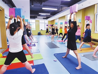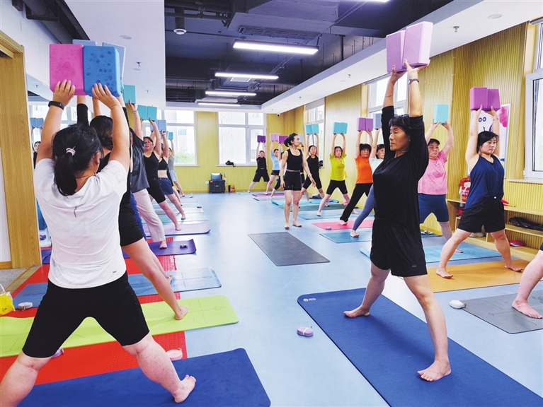 “吸气,呼气,肩下沉……”上午10时,玉园南社区的活动室内,20余位居民跟随瑜伽老师的指导,舒展身体。空调送来的习习凉风与轻柔音乐交织,让人感觉惬意、放松。