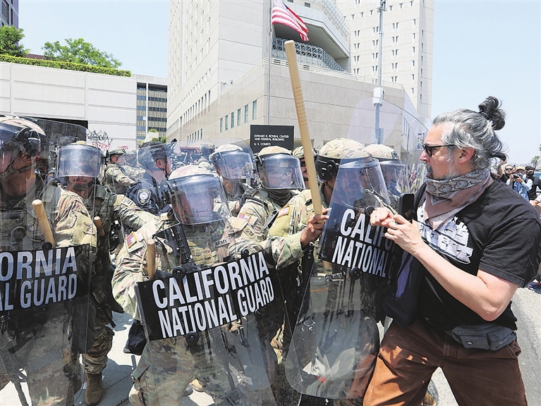 6月8日,在美国加利福尼亚州洛杉矶市中心的联邦执法机构门前,抗议者与国民警卫队人员发生冲突。 新华社 发