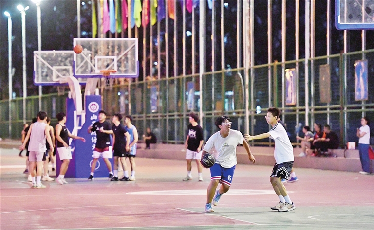 高温天气,不少市民选择在清凉时分锻炼健身。图为6月9日晚,山西财经大学篮球场上,同学们挥洒汗水,展现活力。