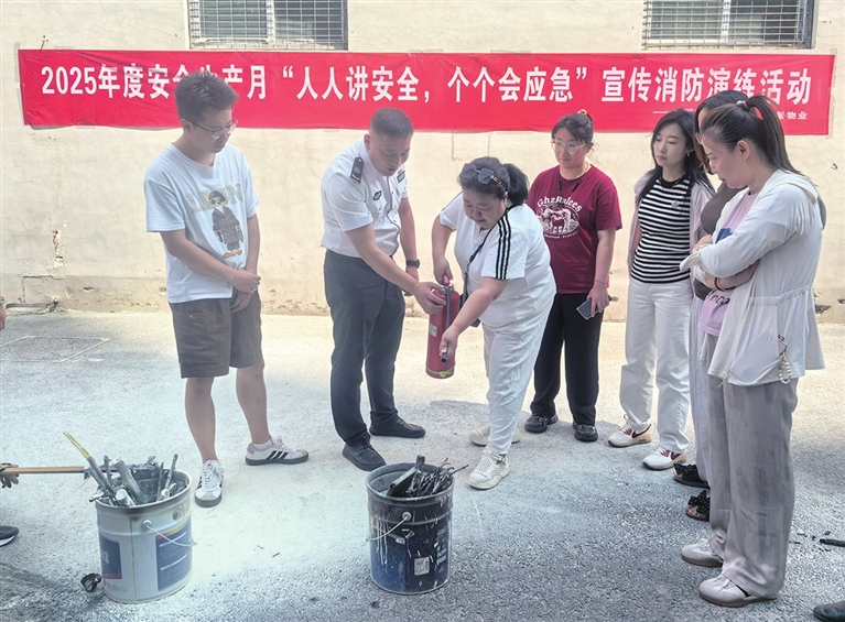 6月10日,迎泽区桥东街道双塔寺街三社区开展2025年度安全生产月“人人讲安全、个个会应急”宣传消防演练活动。图为工作人员为居民讲解灭火器使用方法。 郭苑甫 张丽娜 摄影报道